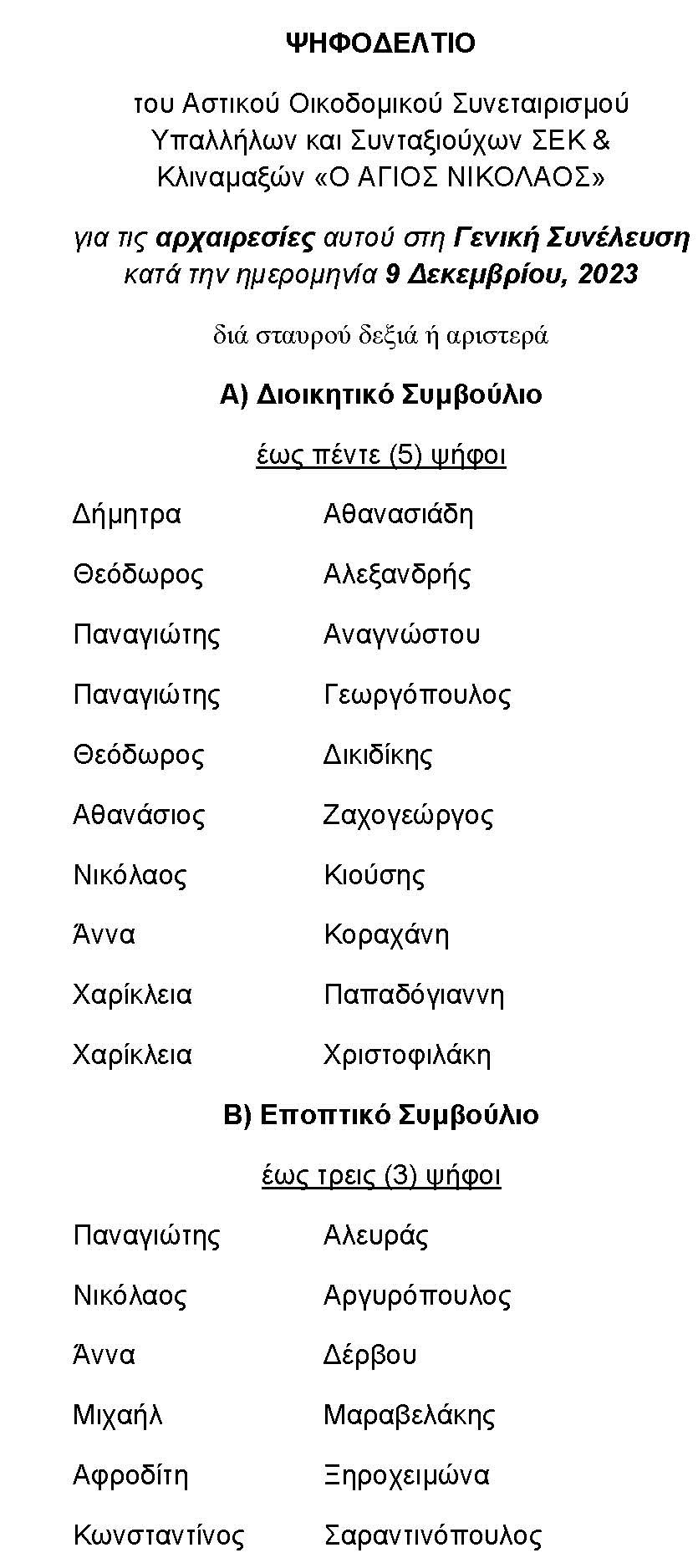 Σε συνέχεια της ολοκλήρωσης των υποψηφιοτήτων για τις αρχαιρεσίες της Τακτικής Γενικής Συνέλευσης, εκδόθηκε το σχετικό ψηφοδέλτιο. Υπενθυμίζεται ότι το Διοικητικό Συμβούλιο αποτελείται από πέντε (5) μέλη (άρ.17, καταστατικού) με ισάριθμα αναπληρωματικά, ενώ το Εποπτικό Συμβούλιο αποτελείται από τρία (3) μέλη (άρ.22, καταστατικού) με ισάριθμα αναπληρωματικά μέλη.[24/11/2023] Αιτήσεις υποψηφιότητας για το Διοικητικό Συμβούλιο στις αρχαιρεσίες της Γενικής Συνέλευσης